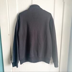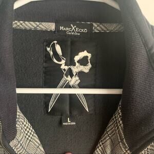 Marc Ecko Cut & Sew Jacket Blue Gray Plaid Stripe.. Blue stripe throughout front pattern of jacket. Full zip. Pockets. Plain, navy back. Scissors logo on left chest. Funnel neck. Contrasting gray and blue design. Size Large {L}. Good, preowned condition.
