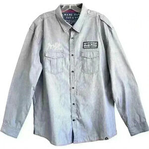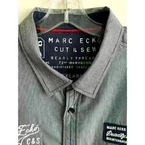 Marc Ecko Cut & Sew Sz XL Navy White Pinstripe Button Up Shirt Embroidery Pocket