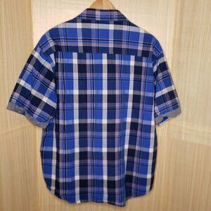 Marc Ecko men’s blue plaid short sleeve button down shirt 3XLT. Gently used condition. Measurements are: 29” from shoulder to hem, and 27” from armpit to armpit.