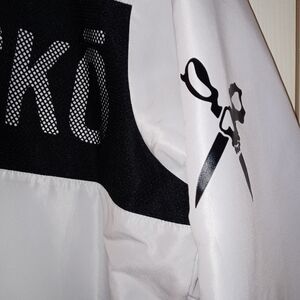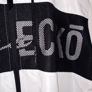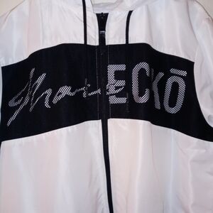 Chic windbreaker with bold branding. Features a hood and zippered pockets. Ideal for casual wear.