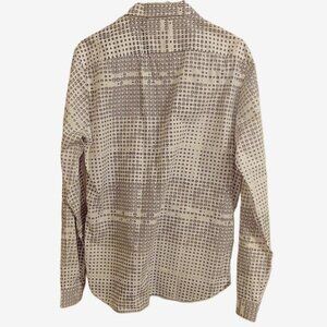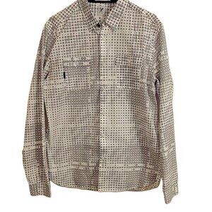 Stylish white and gray patterned button-up shirt. Features a classic collar and front pockets.