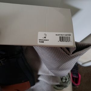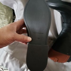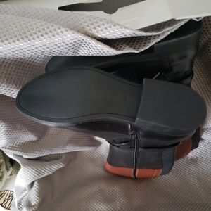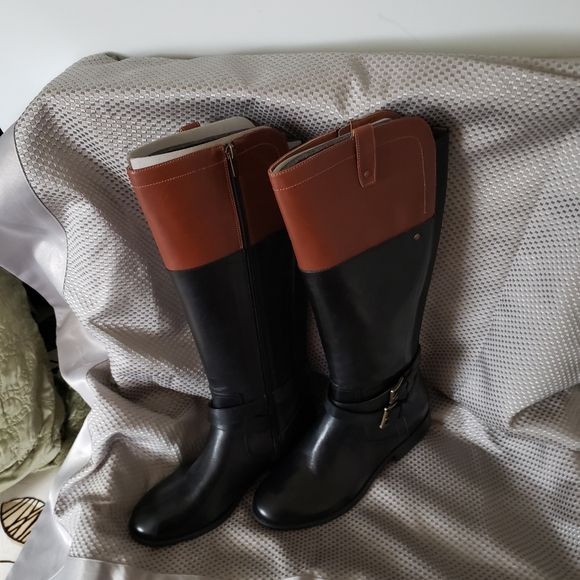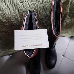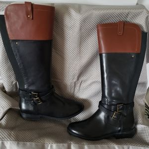 Beautiful Black and Brown leather riding boots by Marc Fisher. Never worn. Size 10M. Standard calf size of 15 inches. There is extra material to expand for a larger calf. Non-skid bottom.