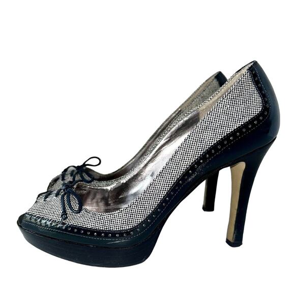 Marc Fisher MFVICA Peep Toe Platform Stiletto Heels Women's Size 8M Navy Leather & Gray Canvas