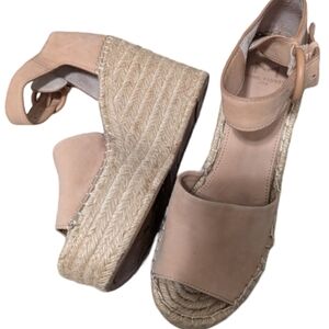 Marc Fisher Alida platform espadrille sandals in beautiful blush pink leather. Features an adjustable ankle strap with buckle closure, open toe design, and retro-inspired espadrille platform wedge. Made with genuine leather upper and leather sock lining. These stunning summer shoes are in excellent pre-owned condition with minimal wear to soles and footbed. Perfect statement shoe for weddings, special events, or elevating your summer wardrobe!