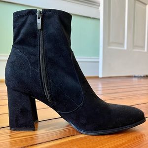 Beautiful Marc Fisher faux suede booties with block heel and pointed toe. Photo of shoe dimensions included. These are size 9.5 and fit true to size. They have only been worn twice. No defects- just simply not the style of shoe I’m looking for. These are a sock boot type of style, and look so good with pants, dresses, and leggings. Easy to dress up or down