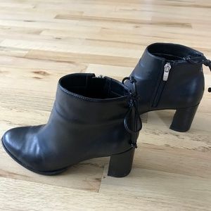 Sleek black ankle boots. Side zipper closure. Chunky heel design.