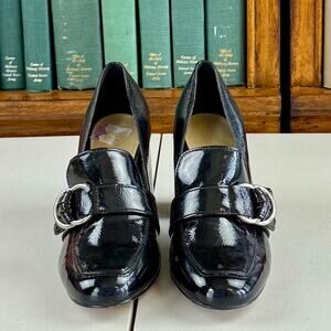Marc Fisher Black Patent Faux Leather "Caila" Buckle Chunky Heel Loafer Sz 6.5