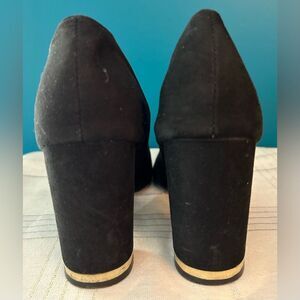 Marc Fisher black suede pumps with block heel and gold accents. The shoes are in good condition.
