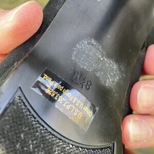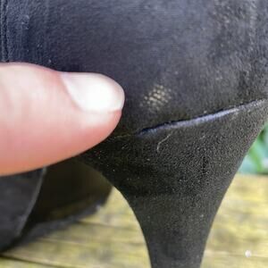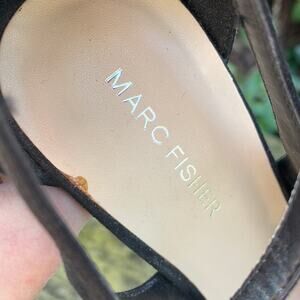 Marc Fisher Black Suede Mary Jane Peep Toe High Heels. Womens size 8 1/2 M. In great preowned condition. Has some light sticker adhesive on right inside foot bed, and on bottom by size stamp. Small manufacturers glue on inside. Some storage wear on right toe. Soles looks great.