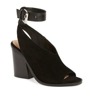 Elevate your style with these sophisticated black heels from Marc Fisher, featuring a chic wrap-around ankle strap. Crafted from a suede-like material, these heels offer a modern and elegant look perfect for any occasion.
