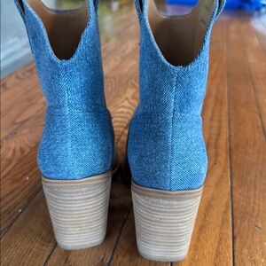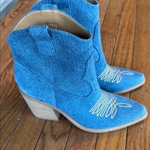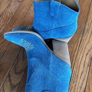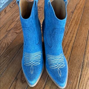 Chic blue western boots with tan accents. Ideal for a fashionable statement.
