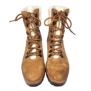 Good condition, gorgeous brown tan suede leather mid calf boots by Marc Fisher in a size 9 womens. Combat style with a lace up front and faux fur/shearling cuff detail. Insoles like new and very clean. Exterior is fairly clean with the exception of some light wear and a couple small marks on the tops of the toes. Light wear on the backs of the heels. Perfect for fall, winter or spring!!