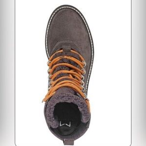 Stylish dark suede ankle boots with tan laces. Perfect for any occasion.