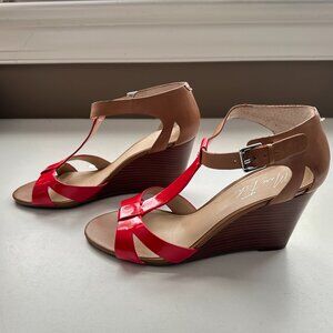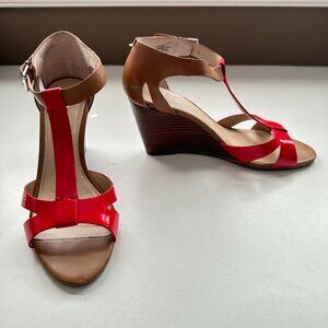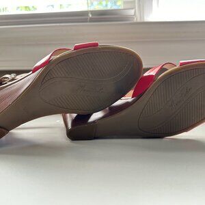This is a pair of women's Marc Fisher shoes in style Bulan. They have a pretty orange/red upper design with a 3.5" high wedge heel. They have a leather/synthetic upper with a rubber sole. There are signs of wear, please see the pictures and reach out with any questions. Comes with the original box.