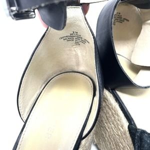 Marc Fisher Cala Wedge Black Suede Platform Espadrille Sandal Women's Size 9M. Some Wear on the Outer Part of the Platform. We replaced a missing strap that held down the belt around the ankle.