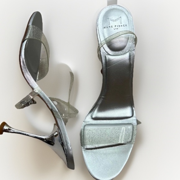 Features: Clear straps, silver chrome heel, Marc Fisher branding, Calisty model, ankle wrap strap