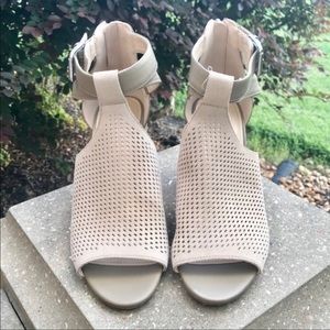 These shoes are NWOT, so no signs of wear on the soles. There is a small scuff on the toe, which is shown in the photos. It has a back zipper and side ankle buckle strap. They are tan. They would be so cute dressed up or down!