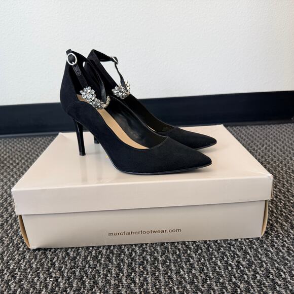 Marc Fisher Dancee Womens Rhinestone Ankle Strap Pumps Heels Black Suede Size 8