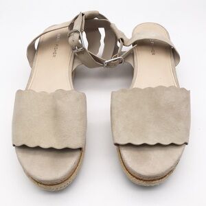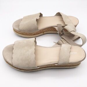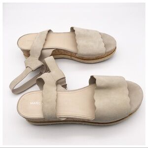 Marc Fisher mixes feminine scalloping with a substantial cork platform and espadrille accents for a stunning lift in these Faitful ankle-strap sandals.
