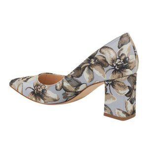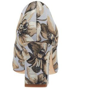 Elegant floral pumps with block heel. Features blue and brown floral pattern. Perfect for any occasion.