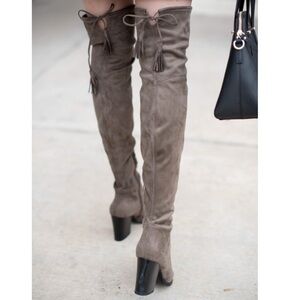 A tassel-embellished topline underscores the retro appeal of a sueded pointy-toe boot in a stunning over-the-knee silhouette. 3 1/2" heel 22" boot shaft; 13" - 16" calf circumference. Partial side zip closure. Textile upper/synthetic lining and sole Condition: new, no box