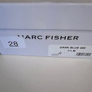 Marc Fisher dark blue patent leather slingback heels with a sharp pointed toe and mid block heel. This style is polished and versatile, ideal for workwear, events, or elevated everyday outfits. The glossy patent finish and clean silhouette give a timeless, modern look that works well with dresses, trousers, and skirts. Light outsole wear consistent with limited use for try ons