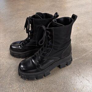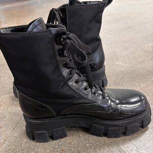These Marc Fisher boots feature a super chunky rubber lug sole and a patent leather construction, with nylon/material side panels on the sides for contrast. The boots are in good used condition. They do have some scuffs (scuffs are from the soles bumping into the sides of the boots because I am clumsy), but I strongly believe these can be buffed out. These are a size 10 - I feel these are TTS (I am normally a 9.5 and these were roomy on me). These still have so much life left in them - only getting rid of because I swapped to Dr. Martens.