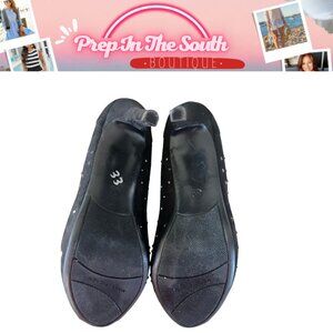 These black peep-toe heels feature striking silver stud embellishments, a 4.5” stiletto heel, and a 1” platform sole for added comfort and stability. Crafted with a sleek textile upper, these slip-on shoes are ideal for evening wear, holiday parties, or nights out. Black rhinestone studs on faux suede material. gorgeous!