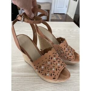 Marc Fisher Hata Wedge Espadrille Sandals Brown Suede Laser Cut Studded Size 8