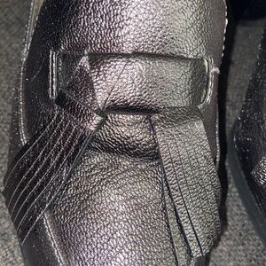 Marc Fisher metallic silver leather healed loafers with tassels. Approximately 2 inch heel.