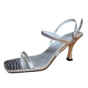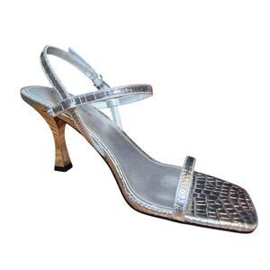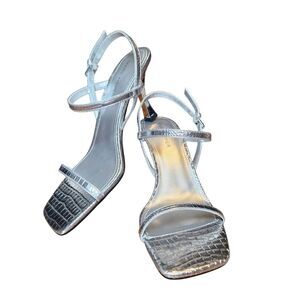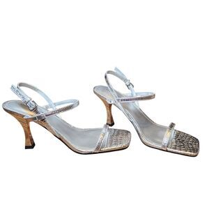 Marc Fisher Heels Sandals Padre Ankle Silver Metallic Leather Snake Skin Chrome Square Toe Slingback