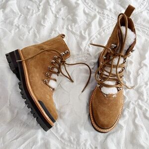 These boots are new and in great condition Plush genuine shearling lends cold-weather appeal to a trend-right, lace-up boot set atop a lugged sole for traction on wet or dry surfaces. 1 1/2" heel; 1" platform 7" shaft Lace-up style Cushioned insole Leather and genuine shearling (China) upper/synthetic lining and sole