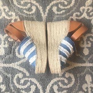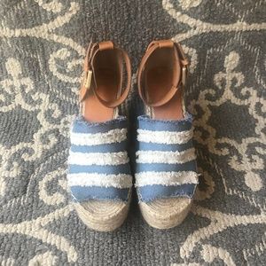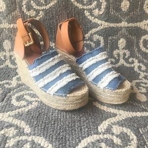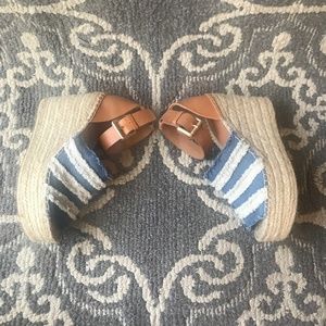 This Marc Fisher LTD Adria Wedge Sandal has a two-tone denim upper, an espadrille platform, and a cognac leather buckle closure back. This wedge has only been worn once and with it is so comfortable with a nearly two inch platform.