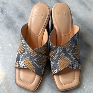 Wide snakeskin leather straps criss cross for style and comfort. Cushioned footbed. Leather upper, synthetic lining and sole.