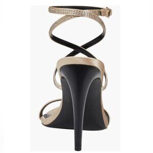 Sparkling rhinestones embellish the slender straps of this satin sandal all the way up and around the ankle.