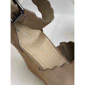 Step into timeless summer style with the Marc Fisher LTD Fia scalloped espadrille platform wedge sandals in size 8M. Crafted from soft tan suede, these open-toe wedges feature feminine scalloped detailing on the vamp and ankle strap, finished with a secure buckle closure. The jute-wrapped wedge and platform add a classic espadrille touch, blending comfort with chic design. Perfect for brunch, vacations, or a night out, these sandals pair effortlessly with dresses, skirts, or jeans. In excellent pre-owned condition with only minimal wear.