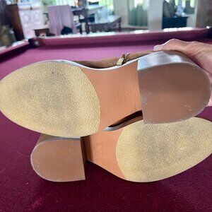 Divesting of all my boots with heels, because my chiropractor says they gotta go! Here are the deets on this lovely pair of tan suede (real leather) booties: