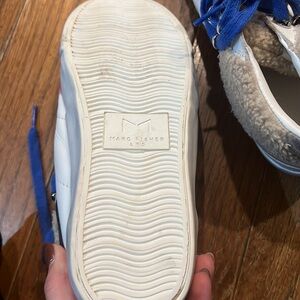 NWOT, LTD Marc Fisher sneakers, leather, faux fur trim, mid-top ankle, white/blue/pink/black colorway. Similar style to golden goose sneakers.