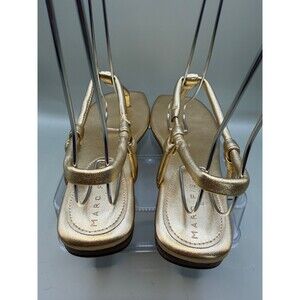 Marc Fisher LTD Maycee Gold Leather Thong Sandal Womens 6.5 M. Open toe, adjustable ankle strap, leather upper and lining, synthetic outsole. New with defects; elastic strap repaired and secure. Casual to dressy summer sandal with breathable comfort. Fast shipping with tracking; 30-day returns.