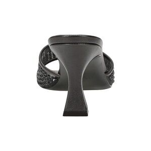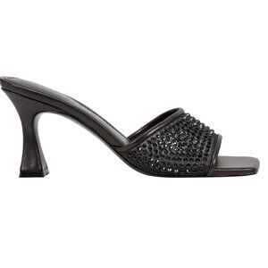 These heeled sandals feature a sleek slip-on design with a modern square toe and an open front. The upper is accented with black embellishments that add texture and shimmer, making them versatile for both day and night wear. The heel has a tapered silhouette with a height of 2.87", offering an elegant lift while staying comfortable for longer wear.