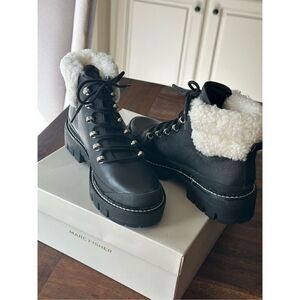 NIB Marc Fisher LTD lace up black Cade combat bootie with white Australian shearling cuff in size 7. Traditional lace-up closure for a customized and secure fit. Classic round toe. Dyed and treated to make them durable and weather resistant. Real fur from sheep originated from Australia. Leather upper. Retail price $225.