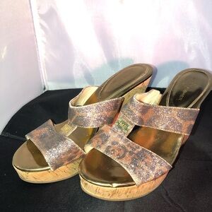 These shoes are in amazing condition other than the back of the left shoe some of the gold has come off. See last picture.