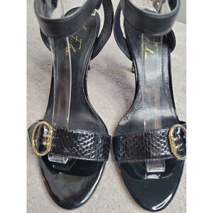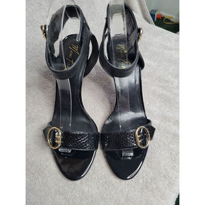 Mark Fisher Malika Black Leather Ankle Strap Heel Open Toe Gold Buckle Women 8.5.