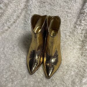 Marc Fisher Masina leather texture Gold slip on ankle heels boots SZ8 M Perfect for adding a touch of glamour to any outfit.Pre owned in good used condition signs of wear on the outer soles and a black transfer marks on the left boot.