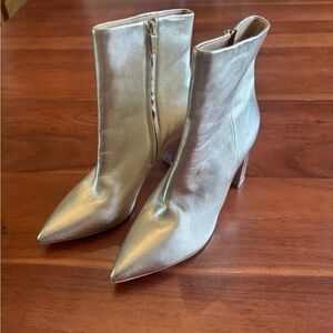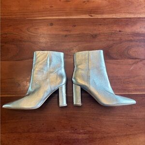 Step out in style with these chic silver/gold ankle boots. Leather upper. 3.5 inch heel height. Zippered closure. Super chic and fun!