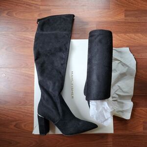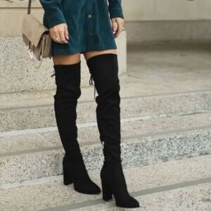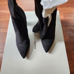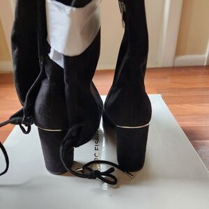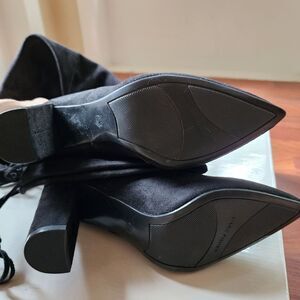NIB with all original packaging. Faux suade and 2” heel with silver metal accent and tie leg for adjustable size. They are just a little too tight for me. If you need measurements let me know!