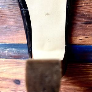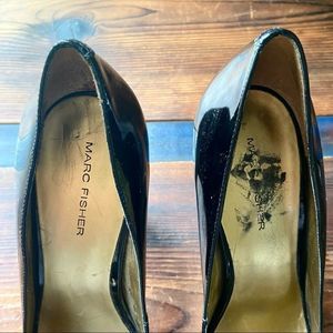 Marc Fisher Patent Leather Heels, Wood stacked heel, Cross peep toe, Used but good condition, FLAW gold is rubbed off a small portion of gold on inside foot padding pictured above , otherwise great condition, Size 9