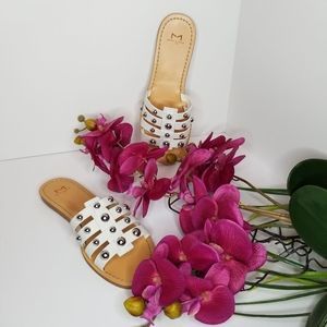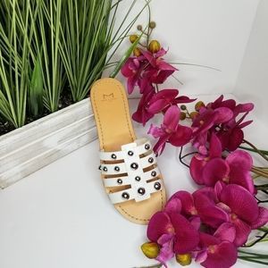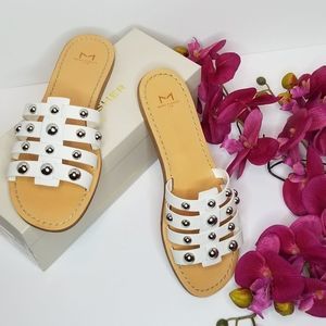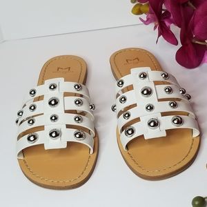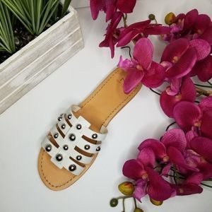 Rounded studs punctuate the straps of a cagey slide sandal with a lightly cushioned footbed.