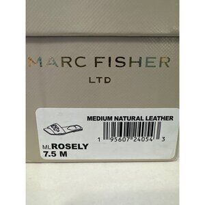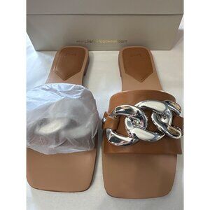 New in box Marc Fisher Rosely Sandals in size 7.5M with a natural leather finish and silvertone chain detail. Perfect addition to any stylish woman's shoe collection. Comes from a smoke free home.