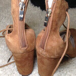 Marc Fisher "Stevee" "8.5" Chunky, Whimsigoth, Fancy Steampunk, Suede, Hippie Chic. Chestnut/Tan, Ankle Lace up, Back Zip, 4" block Heels. No visible signs of wear; Gently Pre-loved.